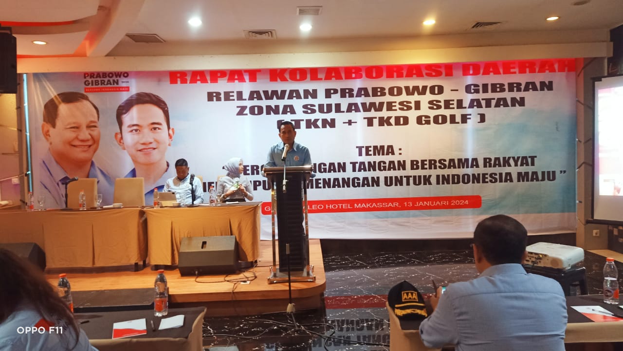 Yudhaindonesianews.Com, Sulawesi Selatan – Antusias 40 organ relawan Prabowo-Gibran masing-masing menghadirkan Ketua, Sekertaris dan Bendahara ( KSB ) Padati Hotel Grand Maleo, dalam rangka rapat Kolaborasi Daerah UN Relawan Prabowo – Gibran zona Sulawesi Selatan TIM Kampanye Nasional ( TKN ) dan Tim Kampanye Daerah ( TKD ) Golf optimis memenangkan Prabowo – Gibran satu putaran 13/01/2024